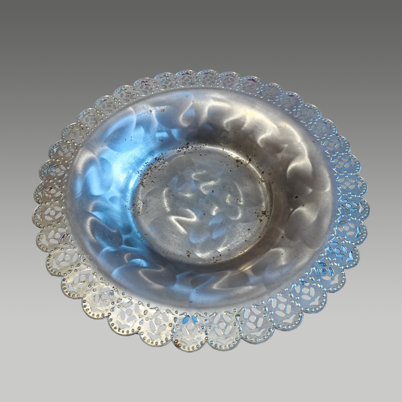 主体为镀银金属,盘面采用锤纹工艺,边缘是精致的镂空雕花设计,兼具装饰性与透气性
