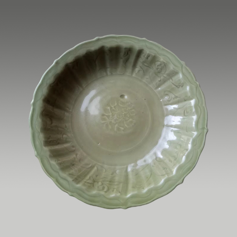 这件青釉花口盘,釉色温润如玉,刻纹精致流畅,兼具雅致艺术美感与较高收藏价值