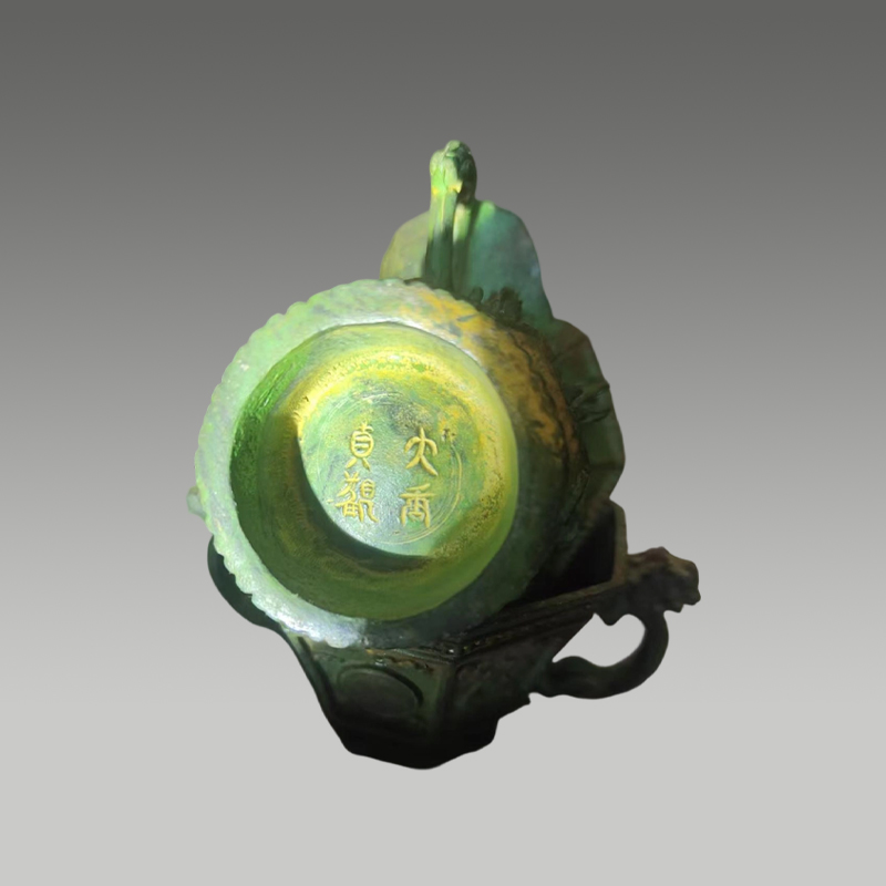 以合同碧玉为材质,采用描金工艺装饰缠枝莲纹,两侧衔环耳设计延续了传统铜器的装饰风格