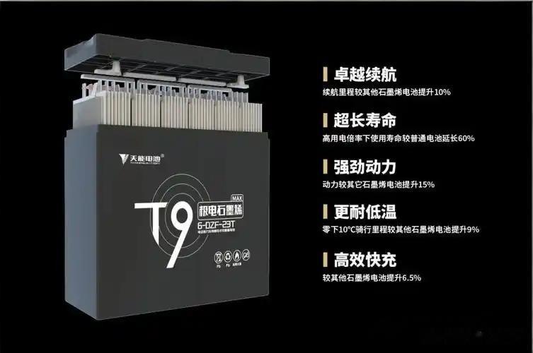 天能推荐T9-MAX极电石墨烯电池,采用五联锻造技术和独特的纳米碳纤制造技术,提高了电池耐低温性能,循环充放电次数达1300次。