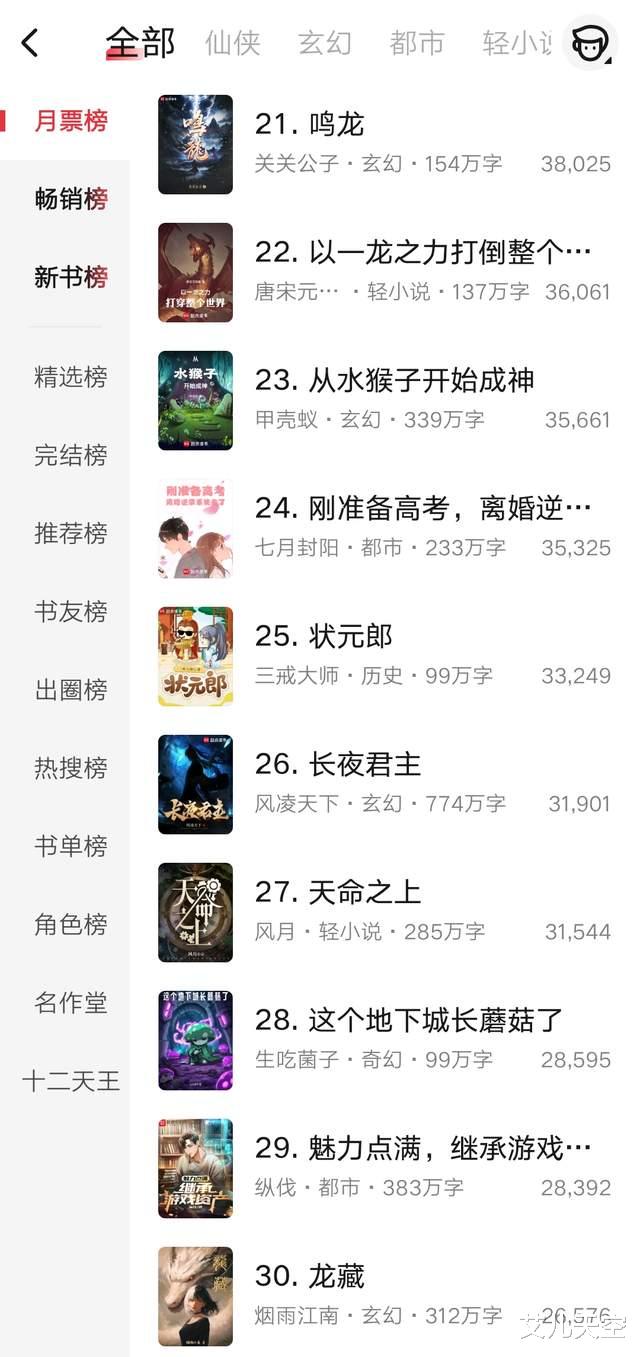一龙之力、长夜君主、地下城蘑菇这三略有上升,关关公子的《鸣龙》第六卷已经结束,要开启新卷了。