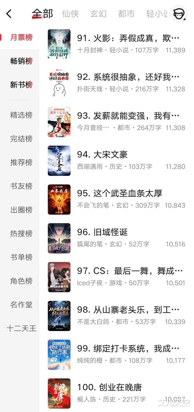这周前百守门员换成了《创业在晚唐》,小说从上周末第110名升了上来,小说看着有大精品成绩的样子。上周末守门的《大乾武圣!》被挤了出去。