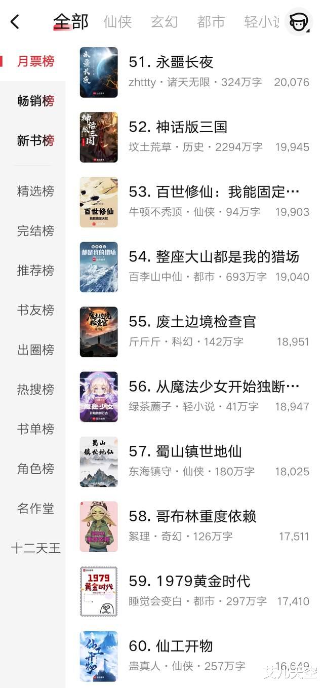 青山、诡秘之主、公务员这三本排名略有上升,其余保持不变或者小幅下滑。