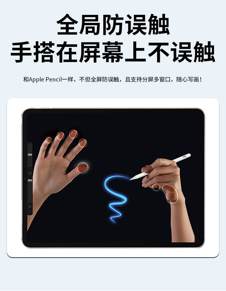 根据我们平时在纸上的书写习惯是把手贴合桌面或者本子上的,全屏防误触功能可以使我们的手部如同在纸上书写一样帖在屏幕上,而且不会出现书写线条错乱的情况。所以说这个功能能极大的还原我们真实书写的体验,建议选择支持全屏防误触功能的电容笔。