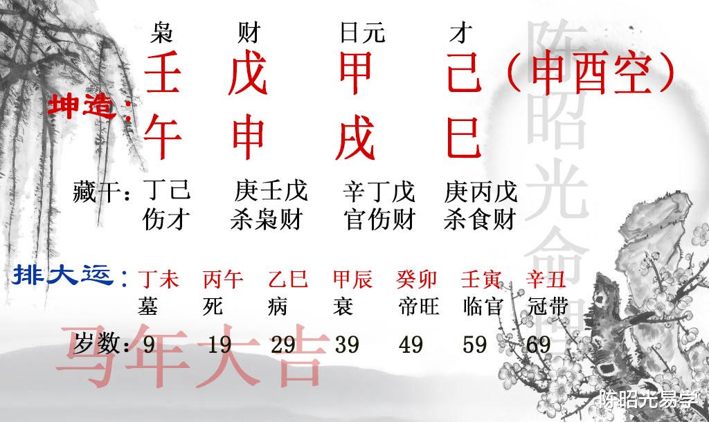 坤造:壬午,戊申,甲戌,己巳(申酉空)