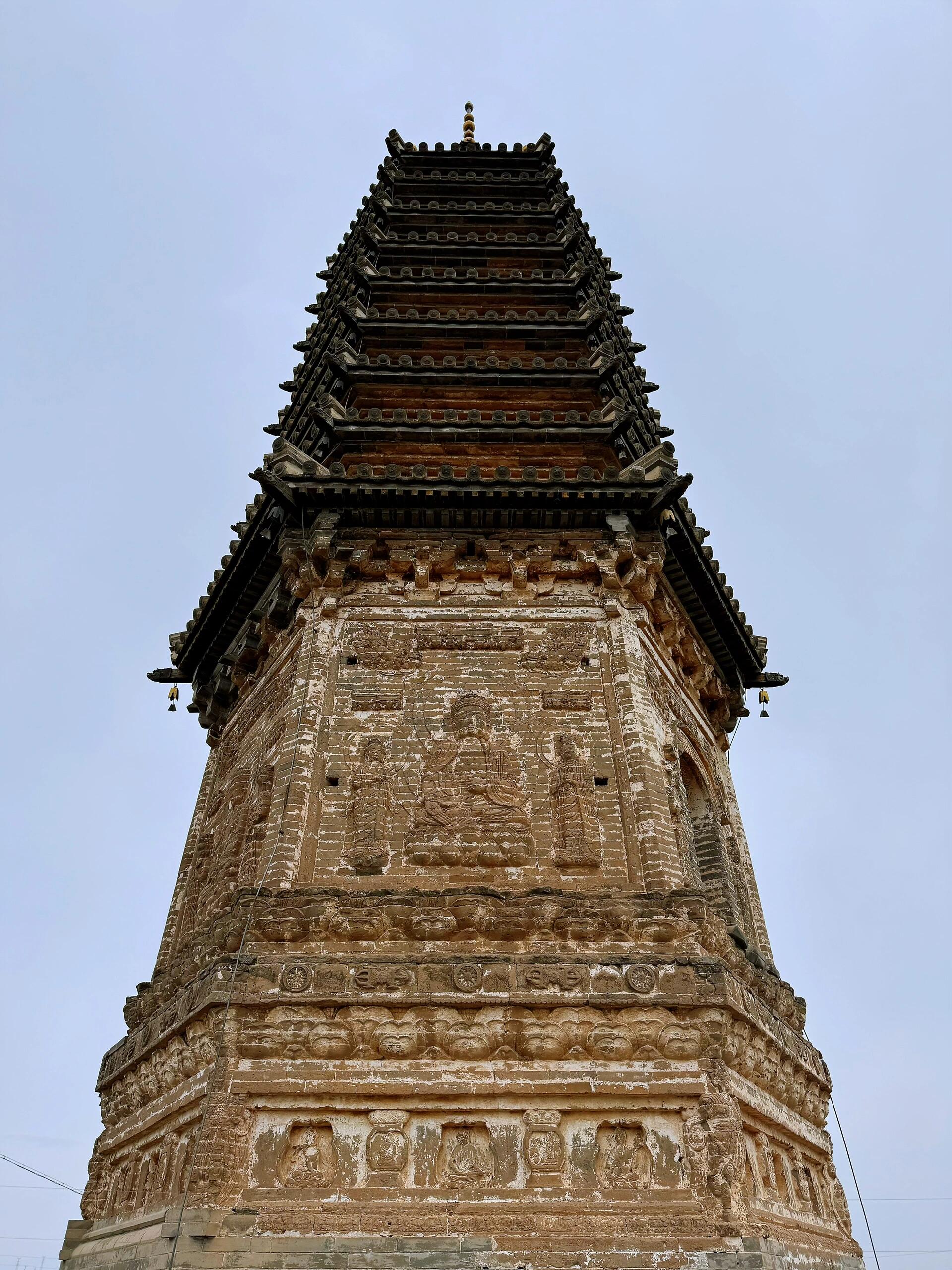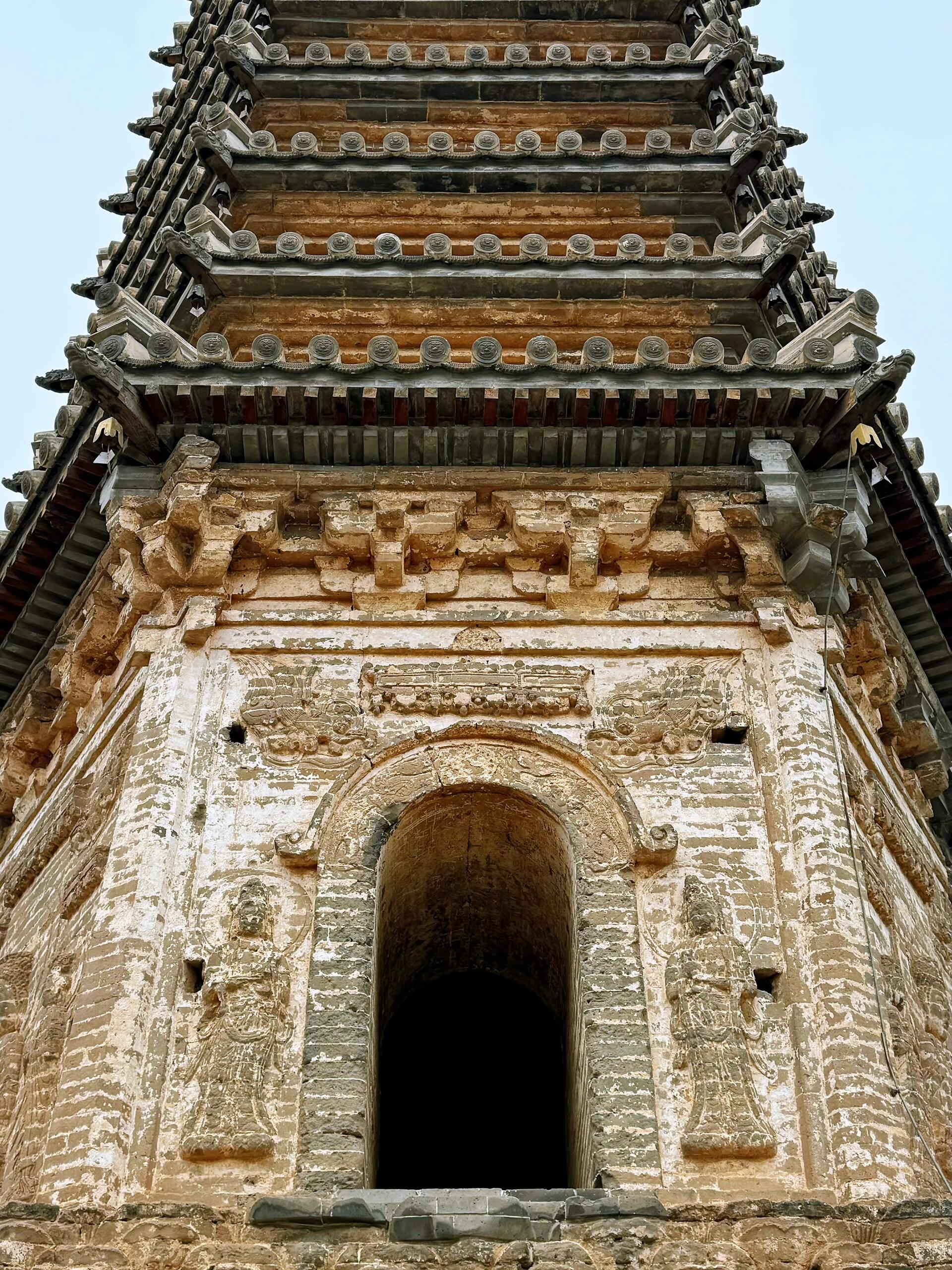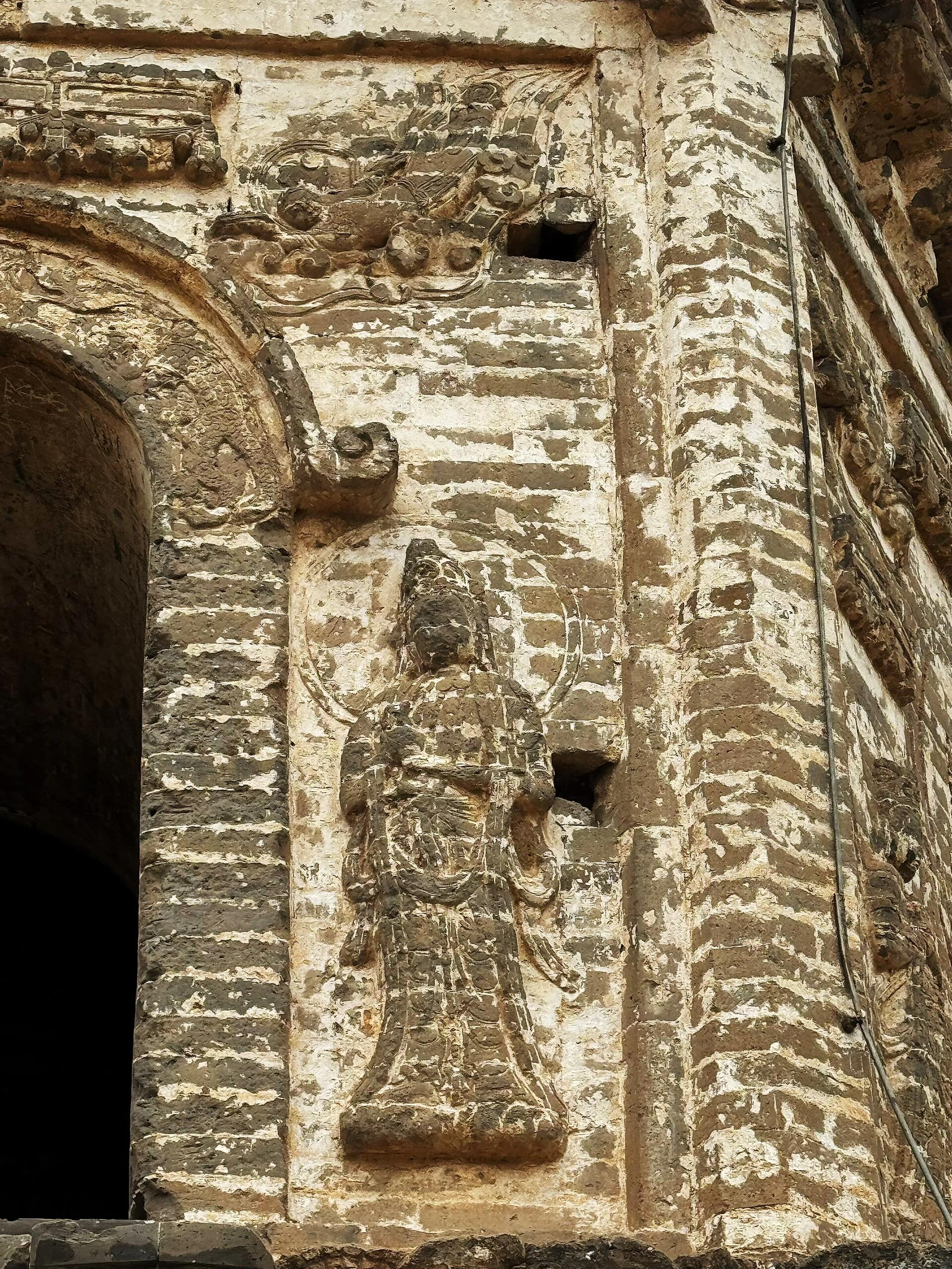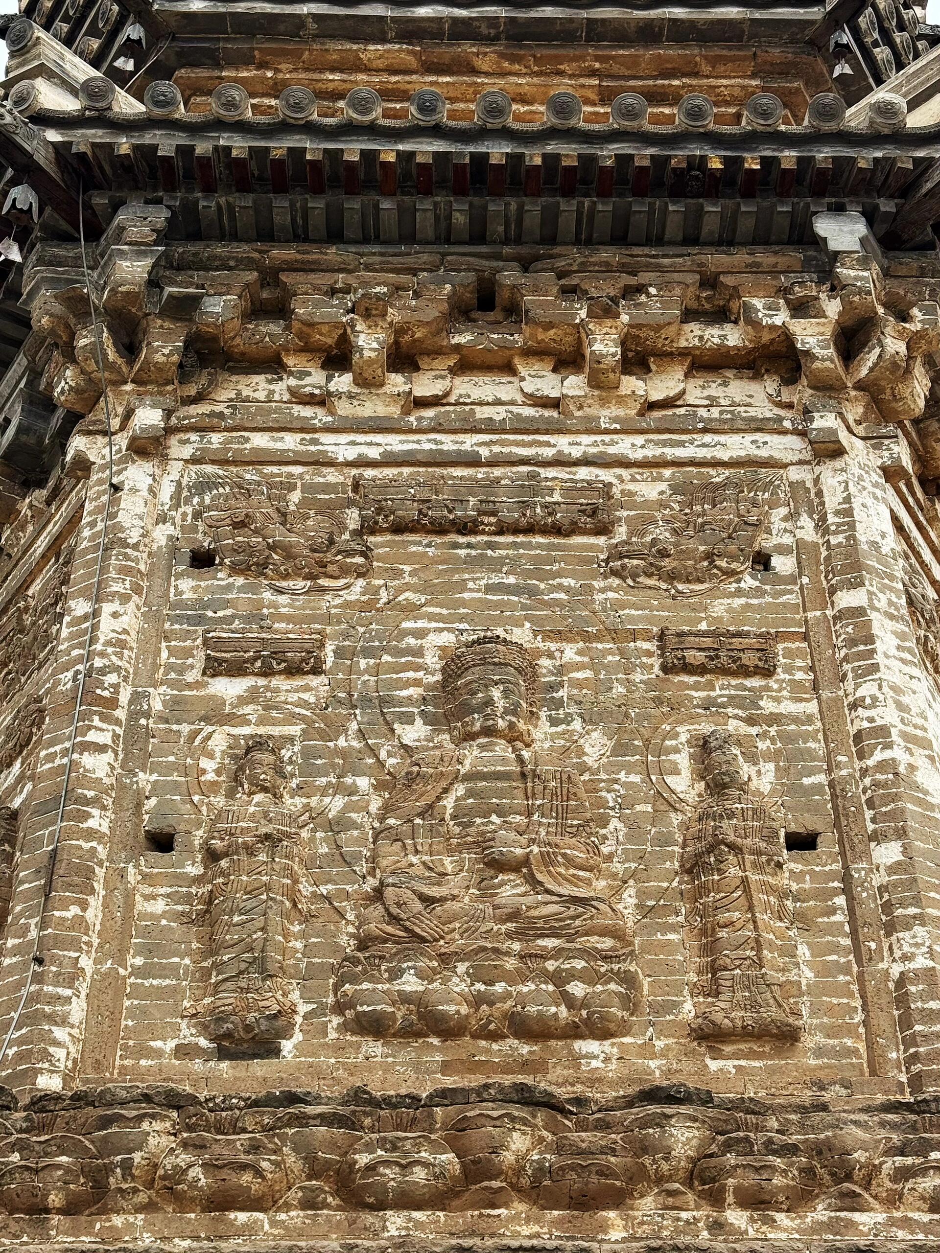 塔身的设计同样精妙绝伦。南面和北面各设一扇假门,门楣上的雕刻堪称一绝。南面假门上方,两条巨龙正在激烈地争夺一颗宝珠,龙身蜿蜒盘旋,龙须飞扬,龙爪张开,仿佛下一秒就要冲破砖石,腾空而起。门两侧,胁侍菩萨身姿优雅,面容慈祥,身披华丽的璎珞,手持法器,静静地守护着这扇门。门上方还垂挂着精美的华盖,华盖边缘雕刻着细致的流苏,两侧飞天衣带飘飘,身姿轻盈,仿佛正凌空飞舞。