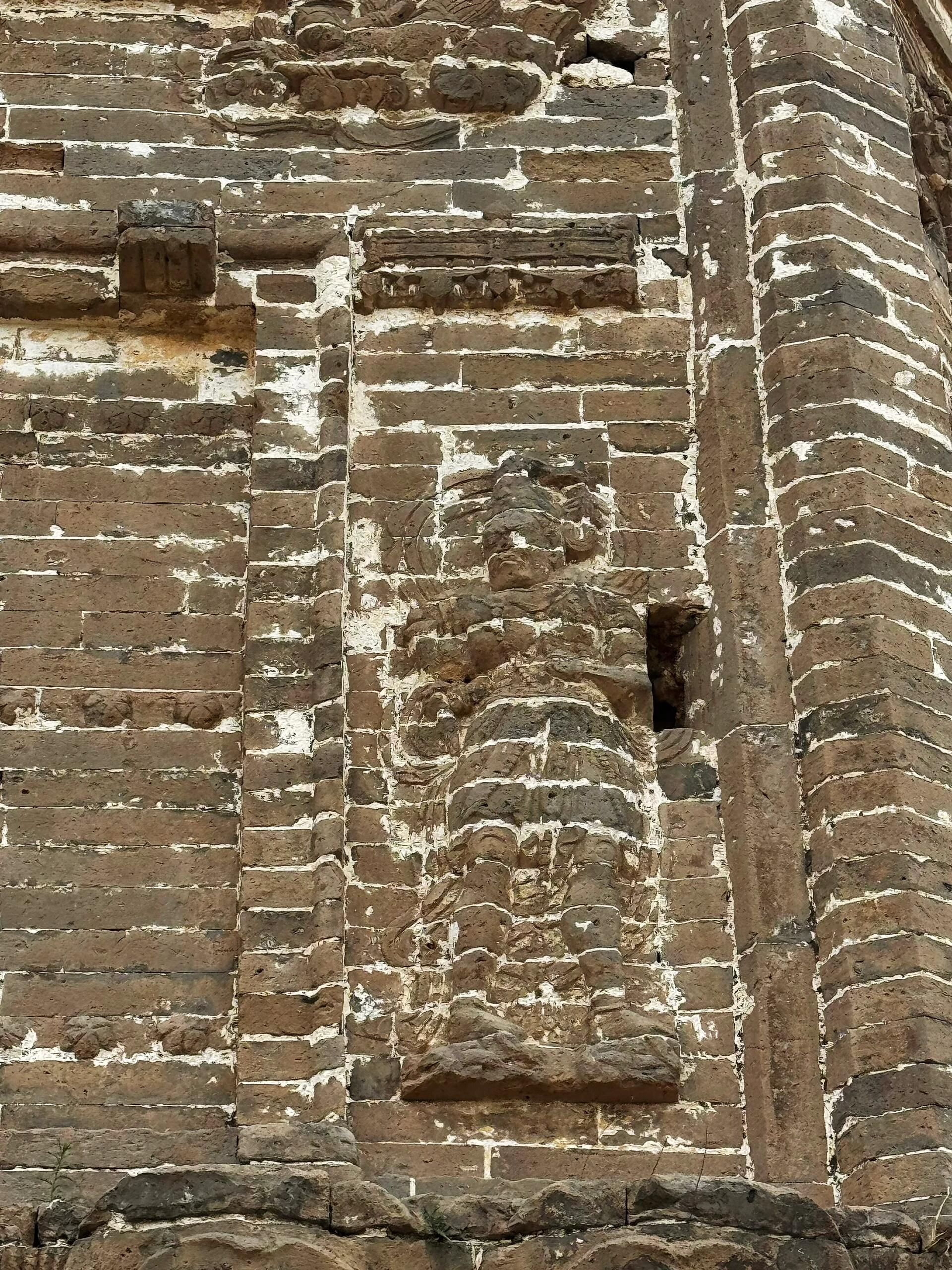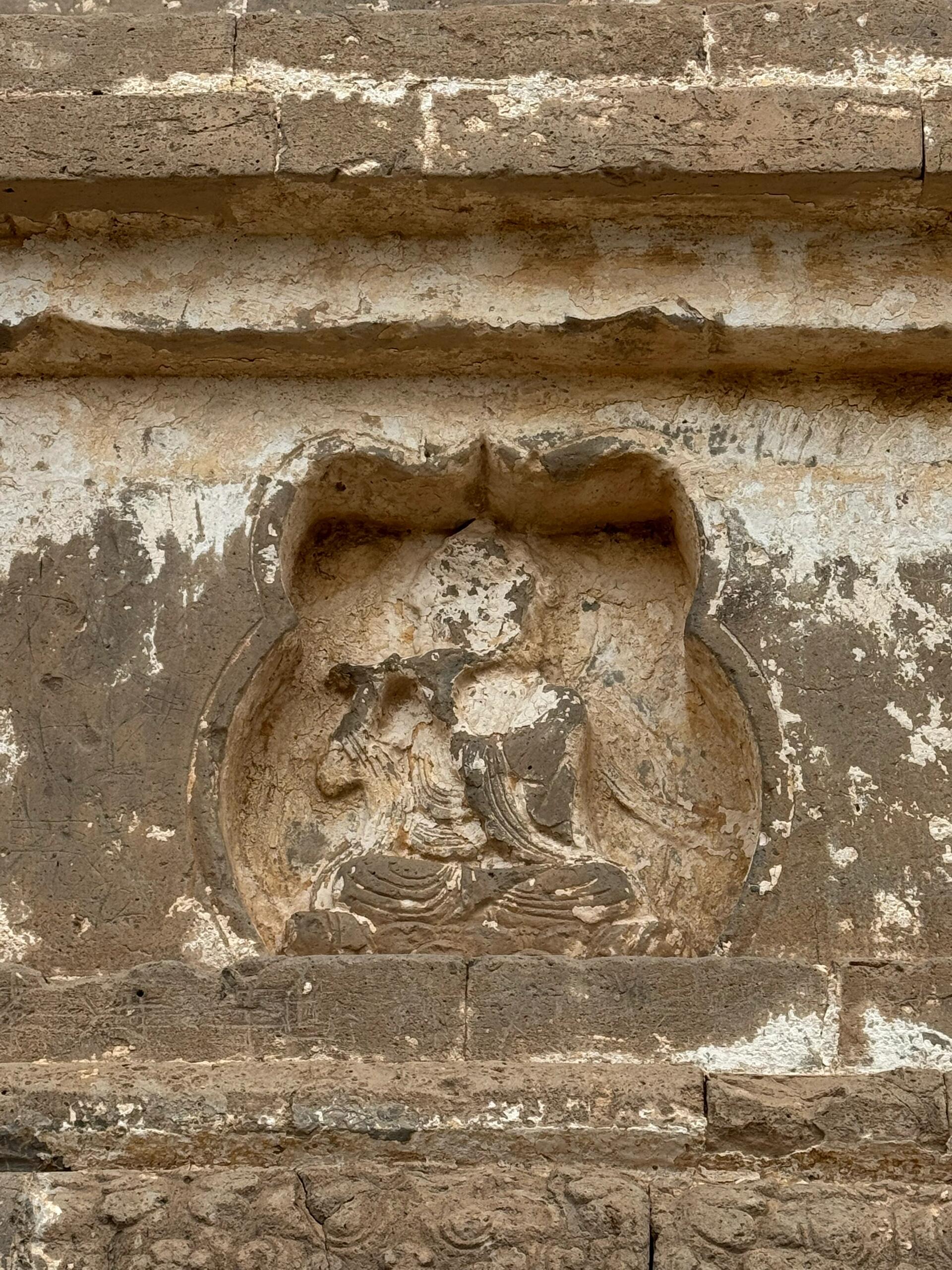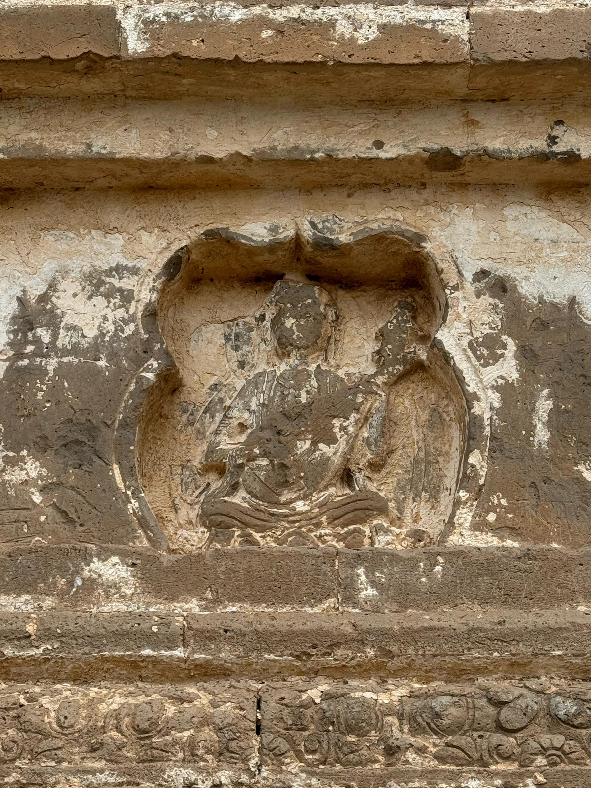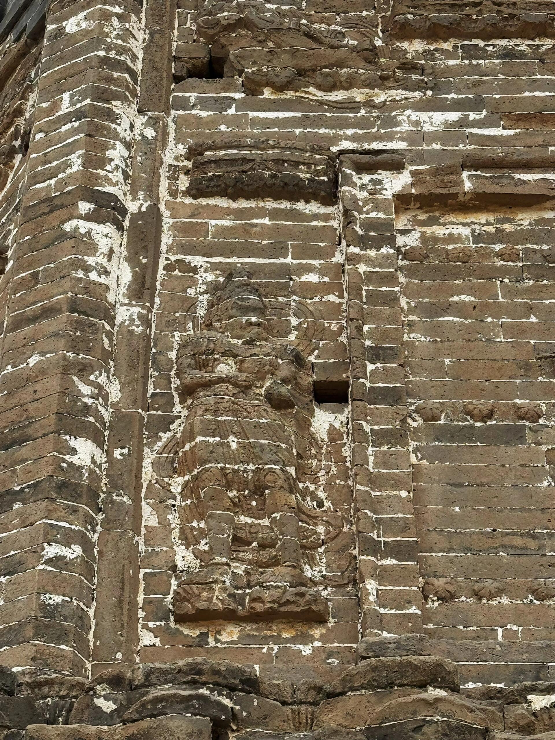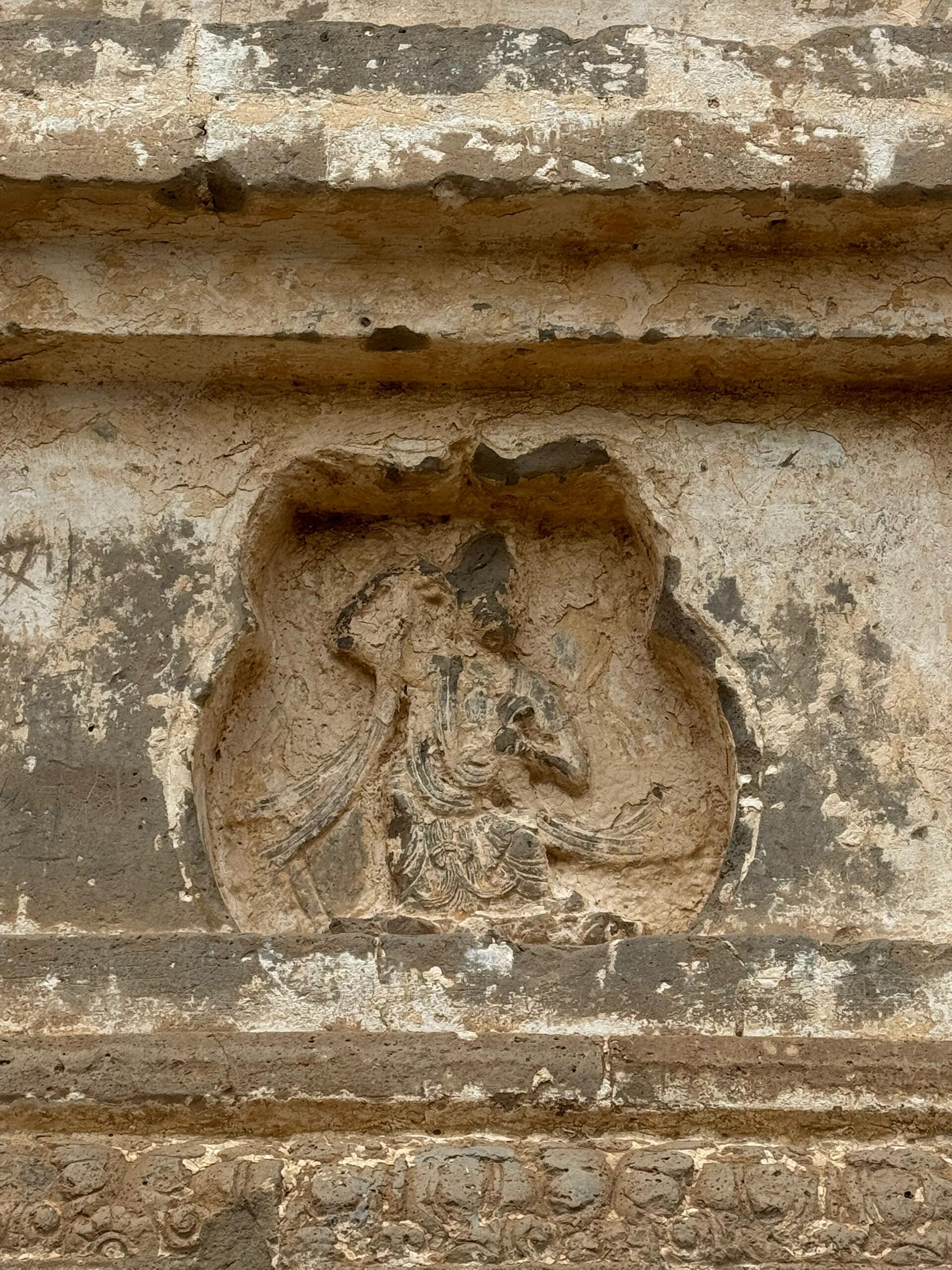 除了南北两面的假门,塔身其他四面中央都雕刻着一尊坐佛。佛像结跏趺坐,面容安详,身披袈裟,衣褶自然下垂。佛像两侧,胁侍菩萨虔诚地站立着,神态恭敬。飞天在佛像上方飞舞,手中捧着各种供品,整个画面庄严肃穆,又充满了灵动之气。