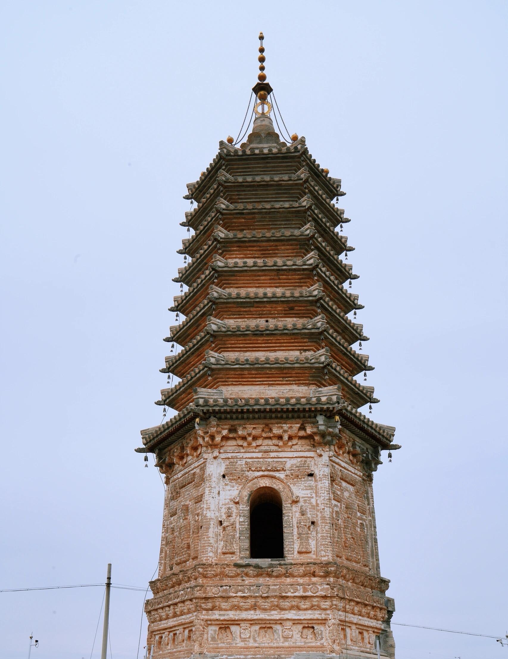 大檐斗栱采用四铺作砖雕斗栱,工艺精湛。每一处斗栱的角度、比例都恰到好处,既起到了支撑屋檐的作用,又具有极高的装饰性。塔上的叠涩出檐由五层砖构成,层层向外挑出,形成优美的弧线。虽然现存八级密檐,第九层密檐和塔刹为维修时补建,但整体依然保持着古朴的韵味,与塔身浑然一体。