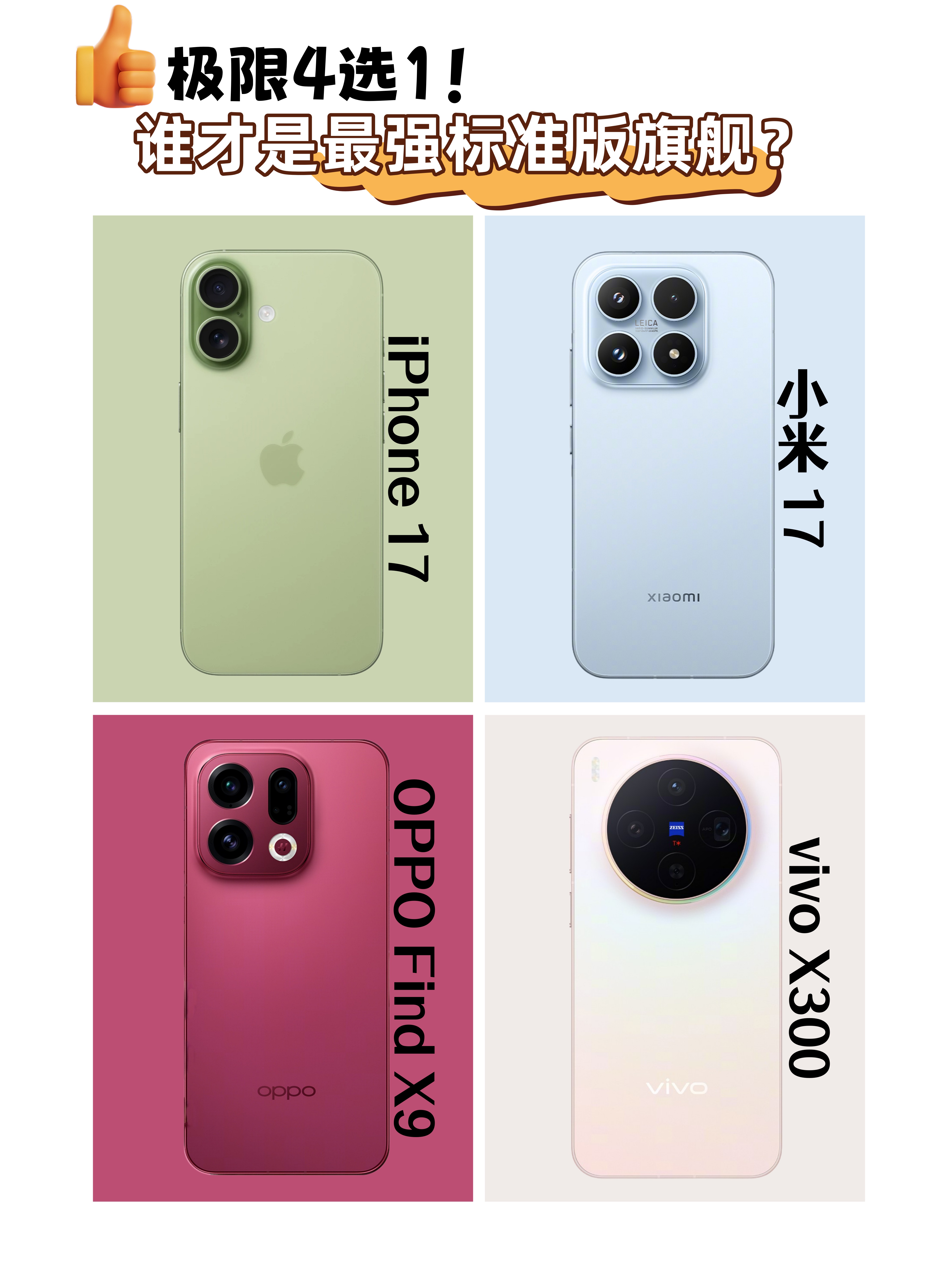 今年标准版的竞争简直激烈!先有“牙膏挤爆”的iPhone 17和依旧真香的小米 17,马上十月中旬又有vivo X300和OPPO Find X9两款新机齐上阵,这波旗舰机到底该怎么选?