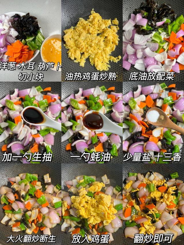 再次热锅,加入洋葱和青椒翻炒,炒至洋葱变软时加入煎好的鸡蛋。