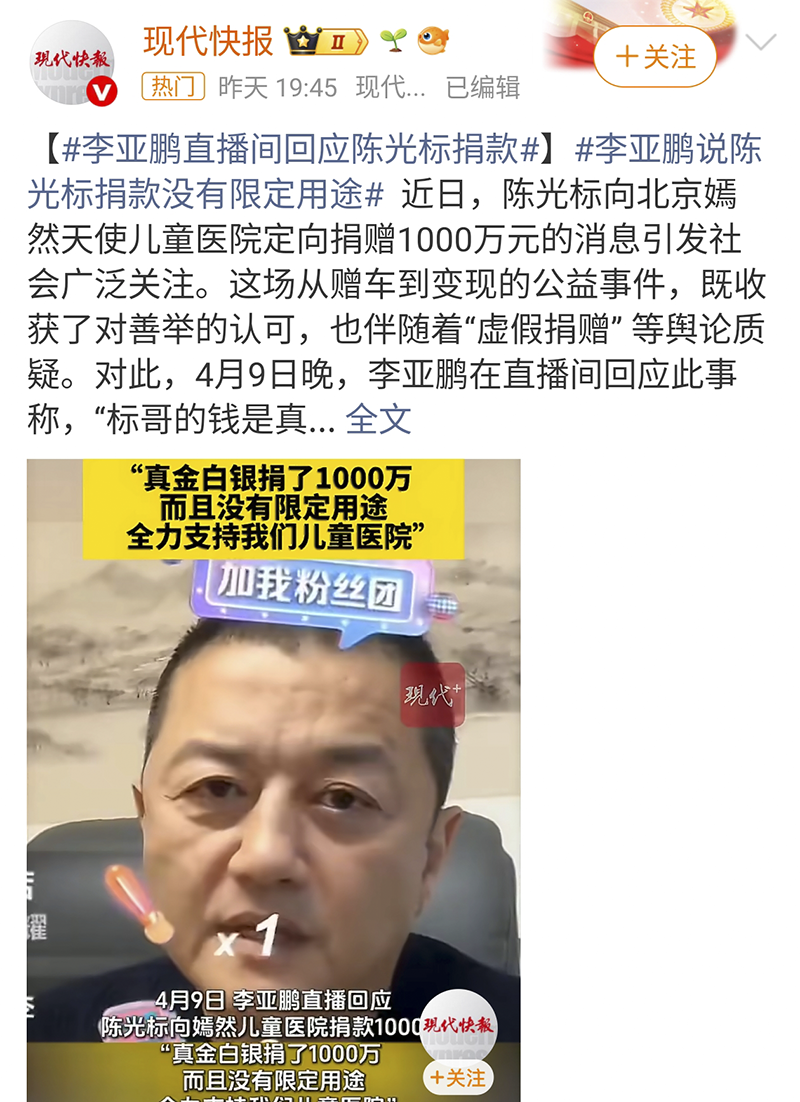 4月9日,李亚鹏公开力挺陈光标,对他的“虚假捐赠”质疑进行回应:“标哥的1000万是真金白银,已经到账了”,终于替陈光标洗清委屈扳回一局。