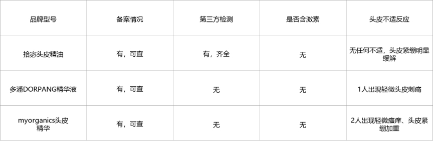 综合实测下来,三款产品的成分安全性有明显差距,拾宓表现最优,多潘和myorganics虽无激素,但缺乏第三方检测,部分脱发人群使用后会出现轻微不适,不适合长期养护头皮。