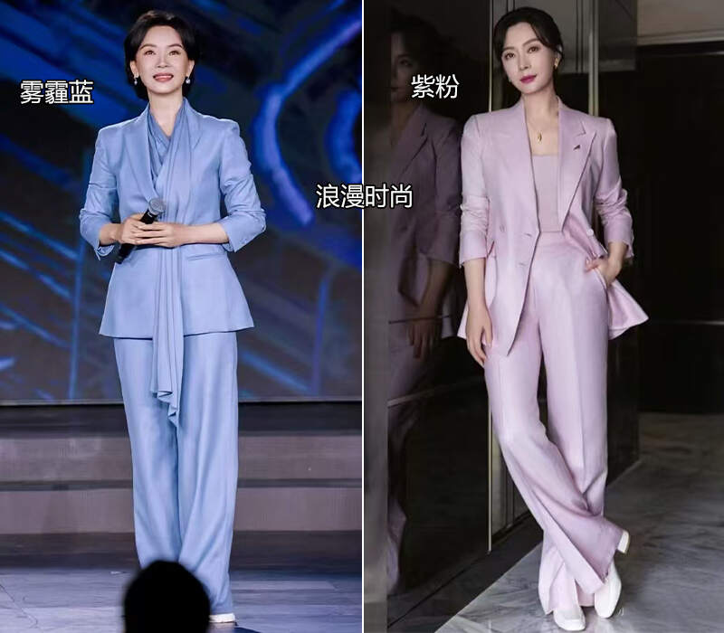 如下图↓,一身雾霾蓝和紫粉色的西装,让她睿智专业的同时又不是温柔精致。这样的穿搭思路对于职场的姐妹是很值得借鉴的。