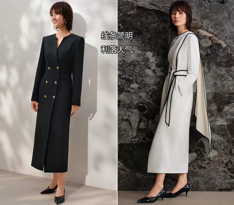 就像下图↓,首先是身体的线条,突出腰线、肩颈线条还有腿部线条。然后是衣服的线条,衣服都是版型利落,黑色的有V领还有两排整齐连成线的扣子,白色的有黑色的描边条纹。这些条纹都加深了袁泉的冷静高智感。