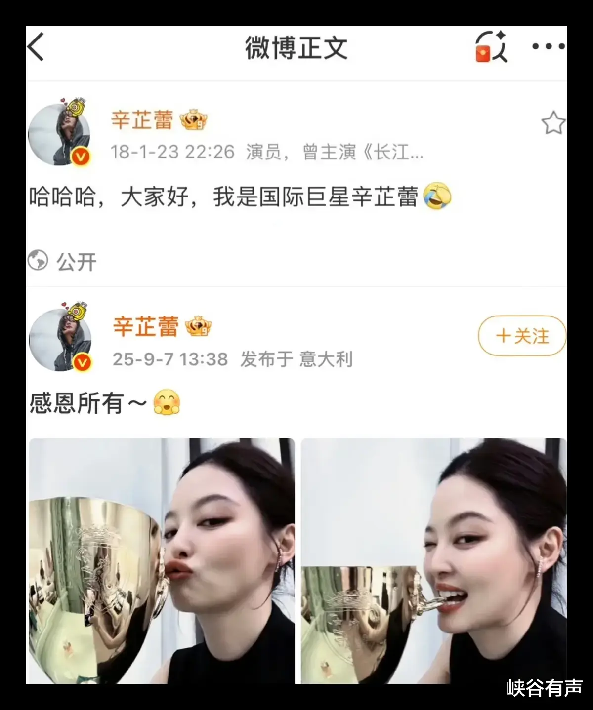 2018年,辛芷蕾在微博写下:“大家好,我是国际巨星辛芷蕾。”