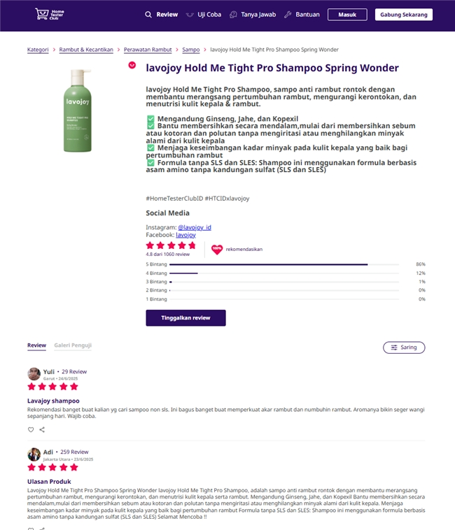 海贝丽致深耕本土化的核心战略,正是基于对当地消费文化、用户习惯与深层需求的精准洞察与深度融入。本次活动,lavojoy 深挖印尼消费者秀发护理痛点,携手全球最大消费者试用社区Home Tester Club(HTC)印尼区,邀请逾千名本土用户,参与试用品牌明星防脱洗发产品 —— Hold Me Tight Pro洗发水,所有参与者均通过视频形式讲述自己最真实的使用体验,全景式沉浸记录对抗脱发的真实蜕变,完整呈现每日使用感受与效果对比,并驱动用户自主生成内容,积极上传分享到社交媒体,引发了大规模的社交破圈和广泛的口碑共鸣。同时HTC基于真实的用户评价生成产品评分,lavojoy Hold Me Tight Pro洗发水 获得了4.8/5的高分好评及99%的用户产品满意度。