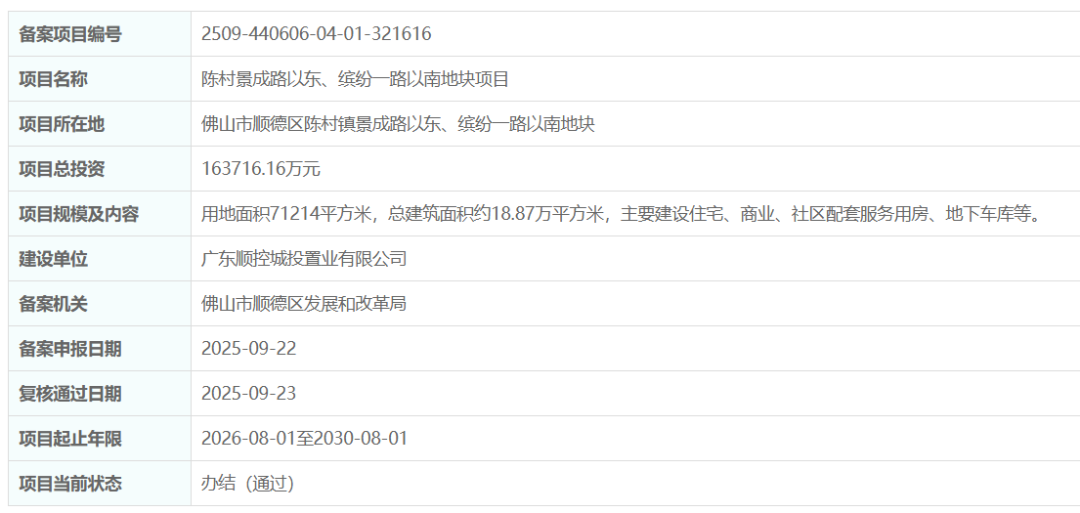 |来源:佛山市公共资源交易中心其实,该地块被顺控城投拿下也意料之中。据了解,该地块在9月时已完成备案。根据备案网信息显示,地块用地面积71214平方米,与此次挂牌总面积略有出入。项目主要建设内容为住宅、商业、社区配套服务用房、地下车库等,建设单位为广东顺控城投置业有限公司。