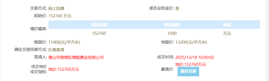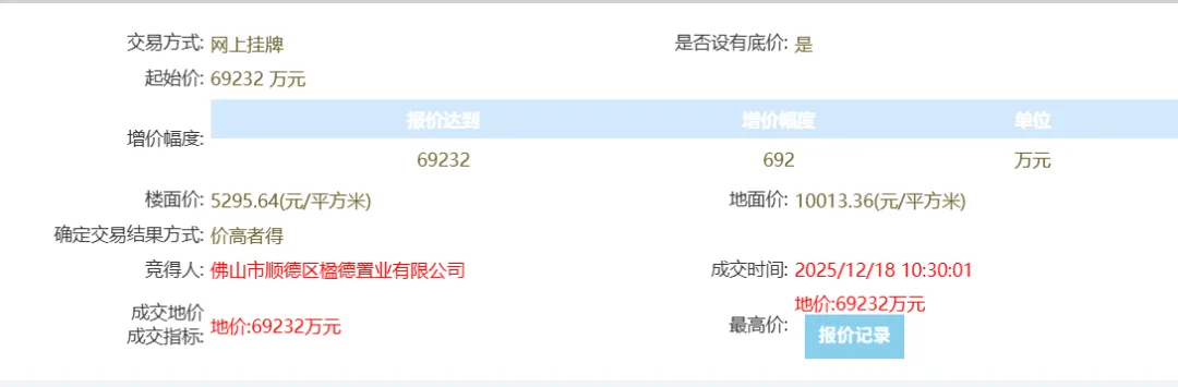 其中陈村镇景成路以东、缤纷一路以南地块成交总价为69232万元,折合楼面价约5295元/平。