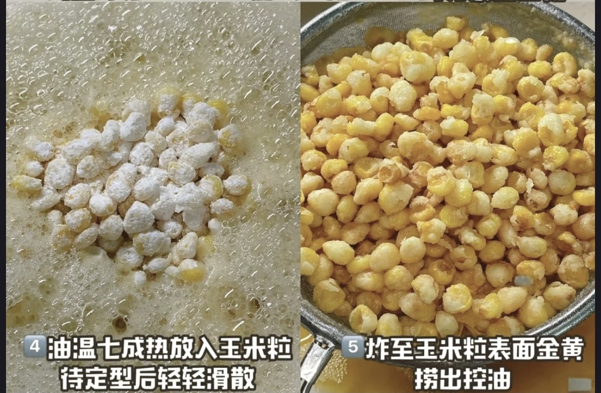 锅里倒入适量的油,烧到七成热的时候,把裹好粉的玉米粒慢慢放进去,先别急着翻动,等玉米粒定型之后,再用筷子轻轻滑散,避免它们粘在一起。看着玉米粒在油锅里慢慢变成金黄的色泽,表面变得酥脆诱人,香味也渐渐飘满整个厨房,忍不住咽了咽口水。炸到表面金黄就可以捞出控油,多余的油脂沥干净,吃起来才不会觉得油腻。