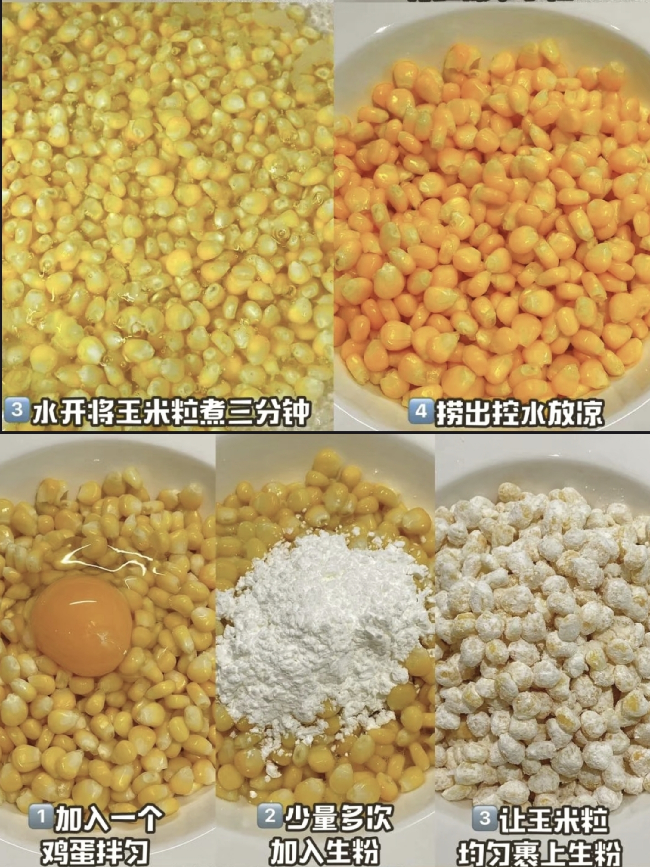 烧一锅开水,把剥好的玉米粒倒进去,煮上三分钟后捞出,一定要充分控干水分再放凉,这可是玉米粒保持酥脆的关键一步。等玉米粒彻底凉透,往里面打入一个鸡蛋,用筷子轻轻搅拌,让每一颗玉米粒都裹上一层薄薄的蛋液。接着少量多次地加入生粉,一边加一边翻动,确保每粒玉米都均匀地穿上一层白色的“外衣”,这样炸出来的口感才会格外酥脆。