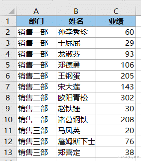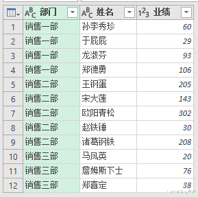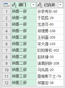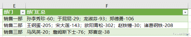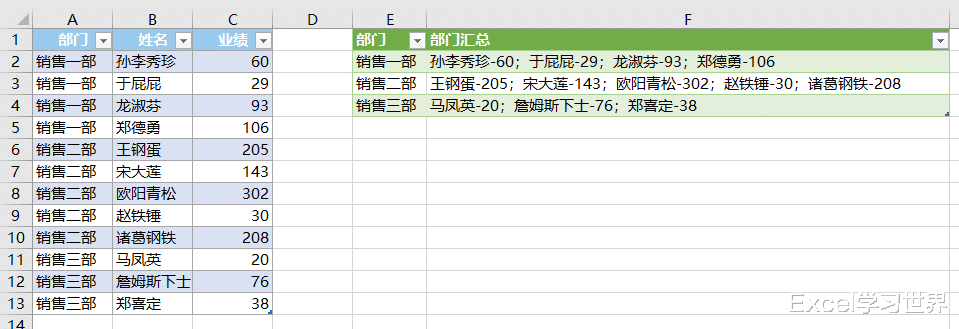 将下图 1 中的姓名和业绩按部门汇总到同一个单元格中,效果如下图 2 所示。