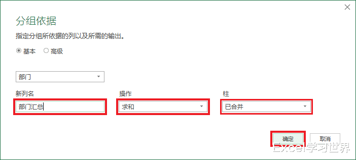 5.按需输入列名 --> 在“操作”中选择“求和”--> 在“柱”中选择“已合并”--> 点击“确定”