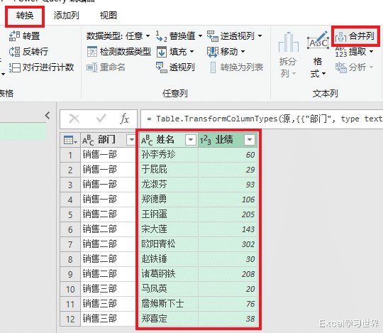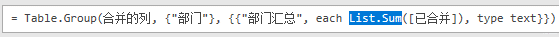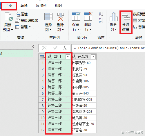 4. 选中“部门”列 --> 选择任务栏的“主页”-->“分组依据”