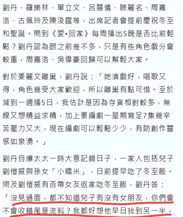 刘丹的回应还是蛮让人意外的,谈及孙女小糯米,称因为奶奶记错日子,一家人提前过了冬至,但被问到刘恺威是否带女友回家吃饭时,刘丹却突然说“没有,不知道儿子有没有女朋友”,称记者应该是收到假消息了,还在现场表示自己也希望儿子尽快找对象。