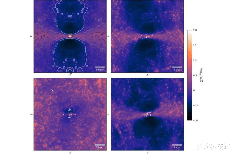 受约束模拟系综后期平均密度的各种投影,并由宇宙平均密度归一化。图片来源:自然天文学(2026年)