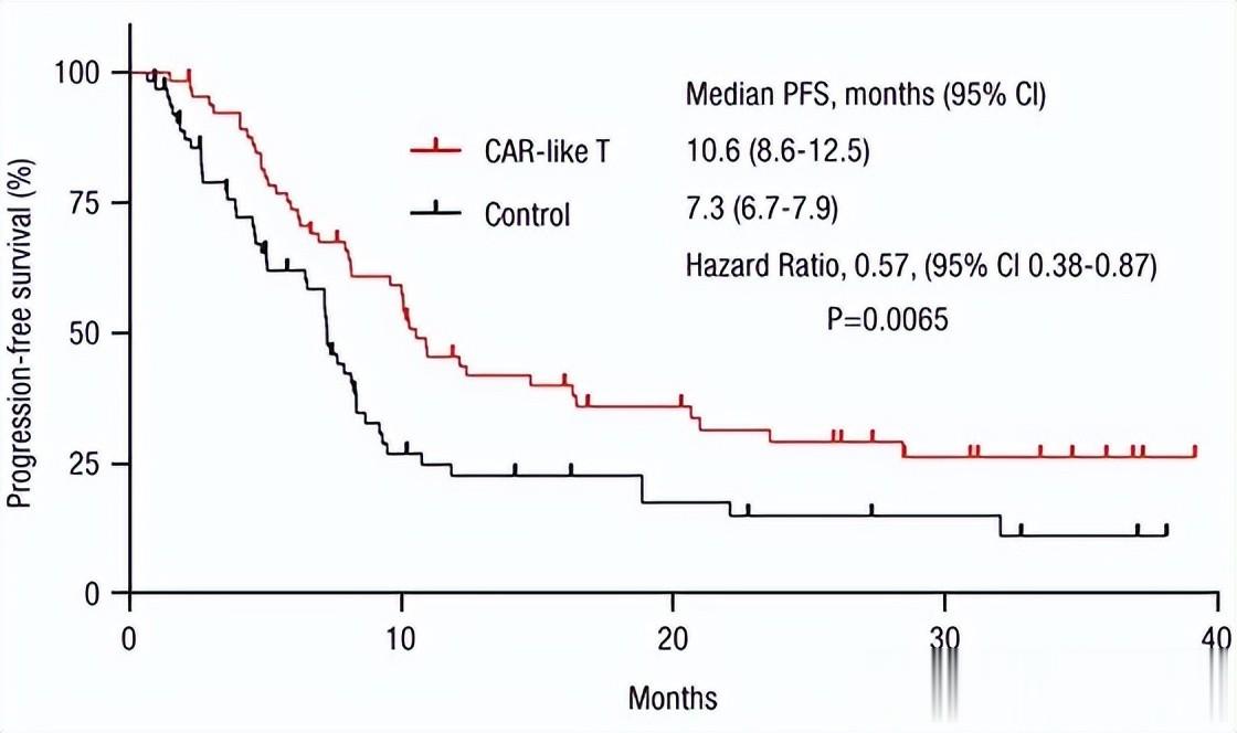 图为接受类CAR-T疗法与对照组患者的无进展生存期 (PFS)比较