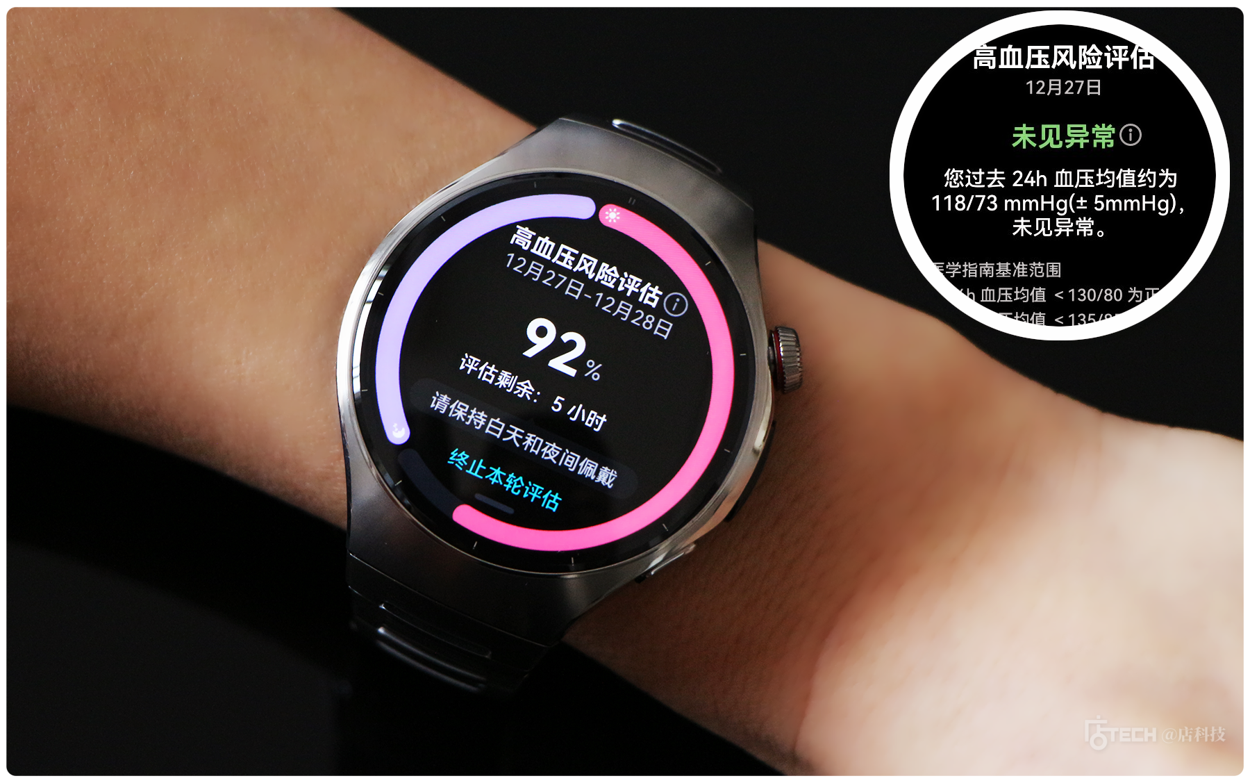同样是得益于多感知 X-TAP 智感窗的到来,华为WATCH 5实现了X-TAP免气囊的高血压风险评估,虽然它并没有配备气囊,却可以通过连续采集白天和夜间不同状态下的体征数据来完成评估,包括24h 收缩压均值、白天舒张压均值、夜间血压均值在内,一旦超过基准范围手表都会给出提醒,尤其对于高强度工作的打工人来说,它可以帮你更好实现血压管理。