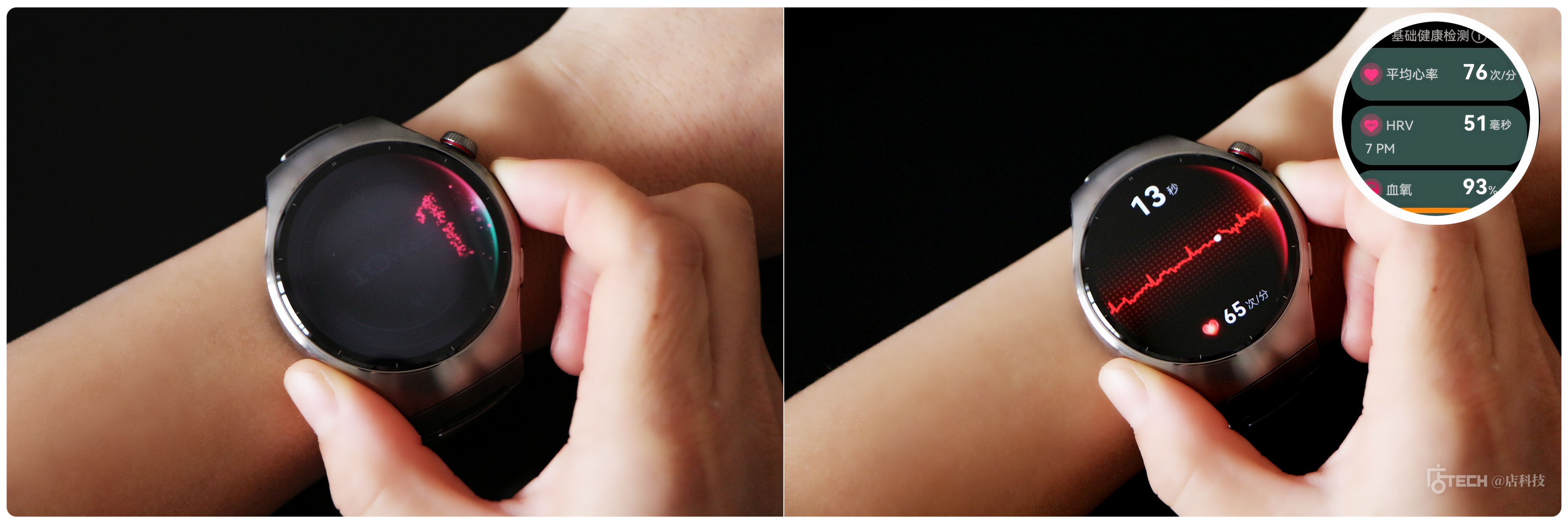 大家应该还记得上文提到的多感知 X-TAP 智感窗,事实上它并非只是装饰物,而是同时集成了 ECG(心电信号)、PPG(光电体积)以及压感传感器,与手表底部的超感知模组形成了分布式部署关系,也是华为WATCH 5 健康监测能力更全面的重要原因。