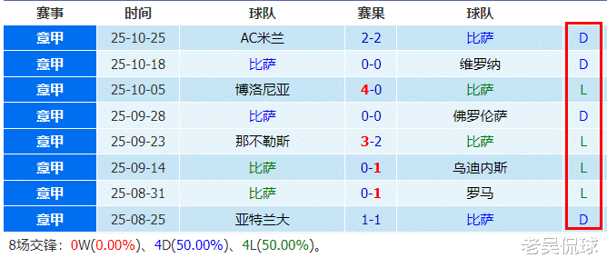 升班马比萨前8轮4平4负,是意甲4支不胜的球队之一。他们的最主要问题是在进攻,迄今只打入5球,其中主场表现比较尴尬,2平2负,一球未进,稍微有点安慰的是,主场也只丢了2球,防守还行。