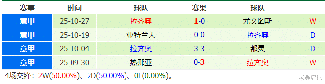 拉齐奥近期状况还行,过去4轮2胜2平,连续不败,期间3次零封。上周末他们主场1比0击败尤文图斯,将后者主帅图多尔打下课。球队客场表现也算低开高走,输给科莫和萨索洛后,大胜热那亚、0比0逼平亚特兰大,赛季头4轮1胜3负的主帅萨里算是缓过气来了。