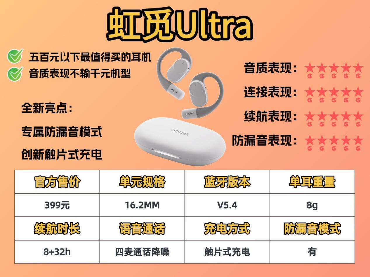 虹觅 Ultra:虹觅是专做声学的牌子,我觉得他们家特别实在,一直琢磨着搞功能创新、把技术落地,定价还不高,就是想让咱们花少点钱,也能有方方面面都好用的听歌体验,这点我还挺认可的。