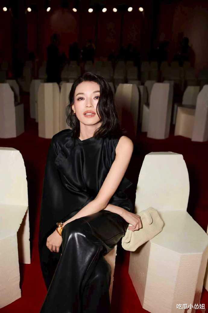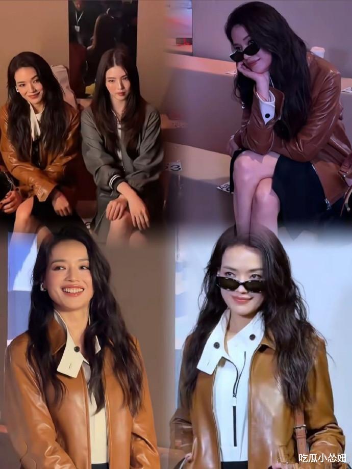 照片中50岁舒淇穿一件焦糖色皮外套配黑裙,妆容清透自然,头发随意披着,坐那儿跟旁边人说话,笑的时候眼睛弯弯的。