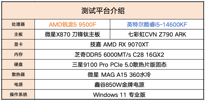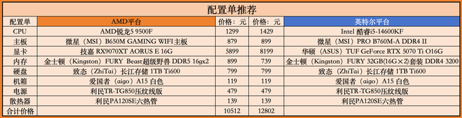 最后从性能、拓展性和1299元的价格,从上面我们整理的配置单来看,全新的AMD锐龙 5 9500F配合上AMD RX 9070 XT的游戏性能表现基本上和英特尔酷睿平台保持一致,甚至部分游戏的话,RX 9070 XT的性能还有明显的领先,从游戏的角度来看,AMD的平台性价比显然更优秀,尤其是整套平台的价格,便宜2000多元。
