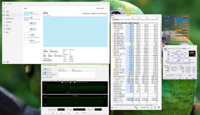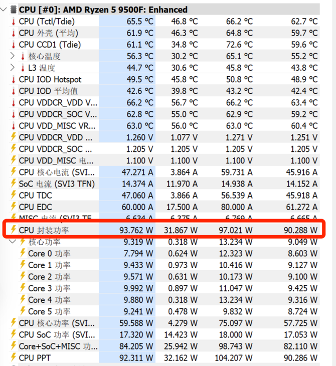 我们单烤CPU,9500F的功耗来到93W左右,如果是单烤FPU的话,功耗在65W左右,这个功耗对比14600KF的180W+的功耗,基本上只有一半,在能耗比表现上,AMD锐龙 5 9500F显然更具有优势。