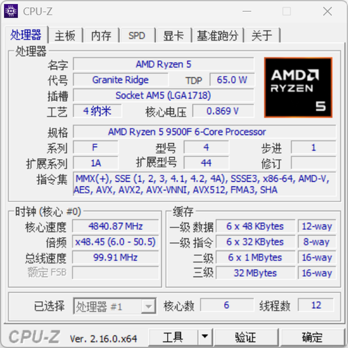 全新的AMD锐龙 5 9500F采用了4nm的Zen5架构设计,拥有6核心12线程的规格,核心代号为Granite Ridge,默认的核心速率为3.8GHz,Boost加速频率可以来到5.0GHz,三级缓存为32MB,总计的核心数量为38MB,默认TDP为65W,接口则是AM5,针脚数量为LGA1718。