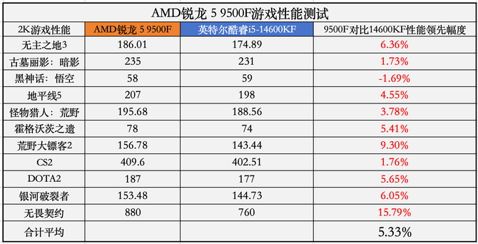 2K游戏性能测试的话,AMD锐龙 5 9500F的性能平均领先幅度在5.33%,差距没有1080P明显,但是在网络游戏方面,AMD锐龙 5 9500F在无畏契约上的领先幅度比较明显,更适合那些网游玩家选择。