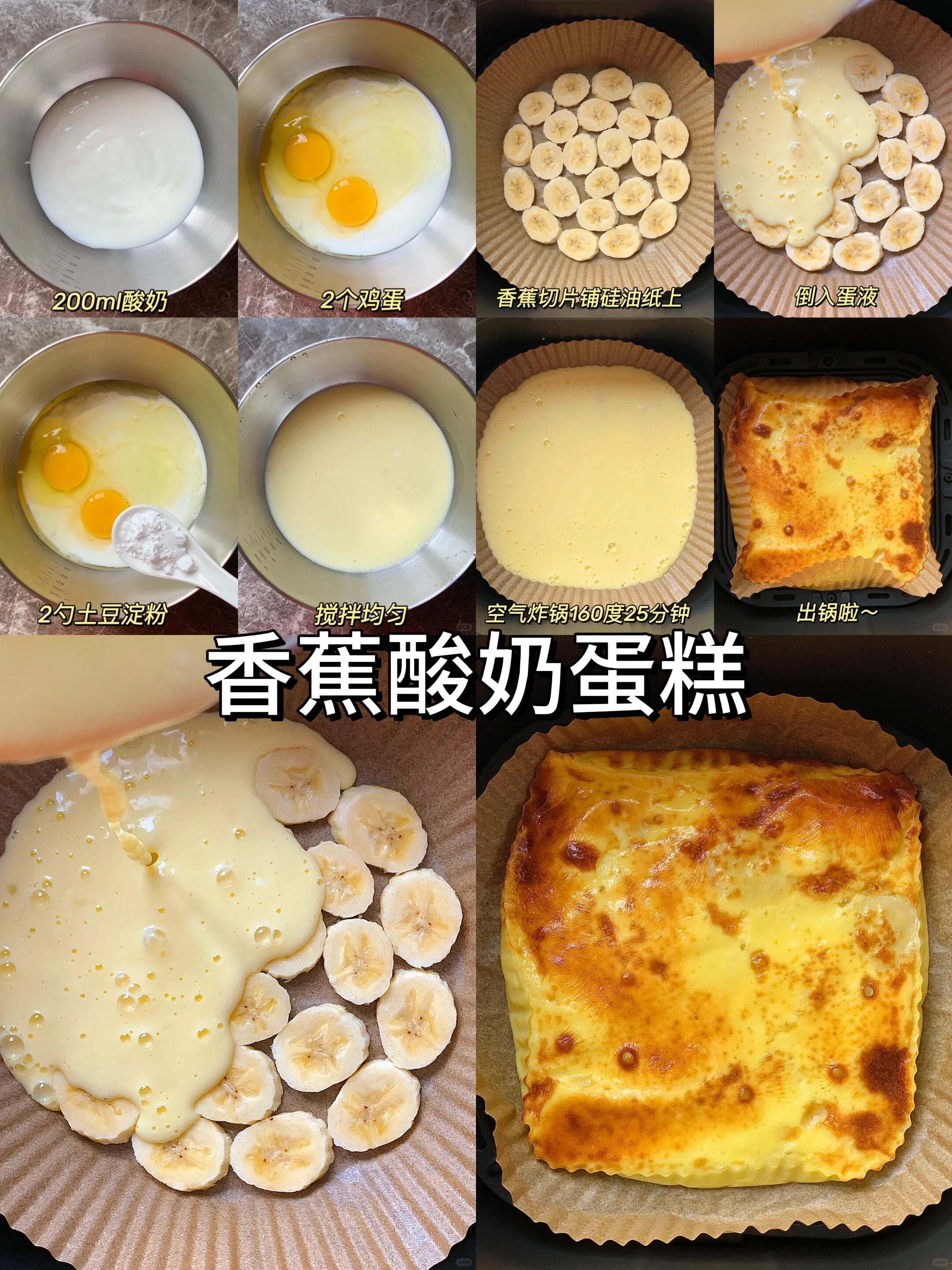 • 减脂党冲:酸奶+鸡蛋+土豆淀粉搅匀,铺香蕉片,160℃烤25分钟,像在吃“云朵蛋糕”,酸甜不腻!