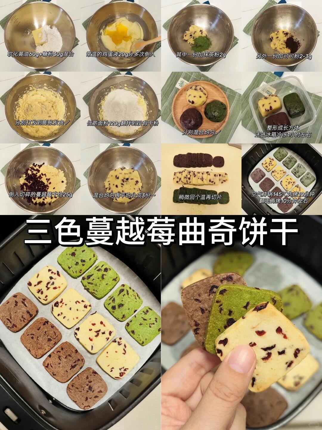 • 做法:黄油+糖打发,分三份加抹茶粉、可可粉、蔓越莓干,冷藏后切片,145℃烤20分钟。酥脆秘诀:面团冷藏1小时定型,烤的时候别开炸锅,不然会塌。