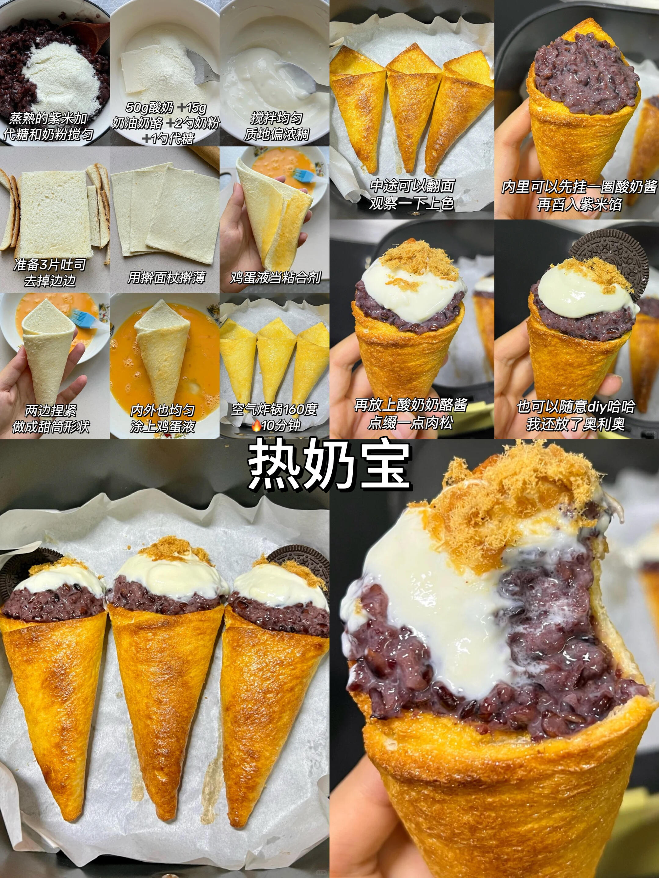 • 做法:吐司去边擀薄,卷成锥形用蛋液粘牢,160℃烤10分钟,填入紫米+酸奶奶酪酱。DIY灵感:还能加芋泥、红豆,甚至辣条,甜咸党都爱!