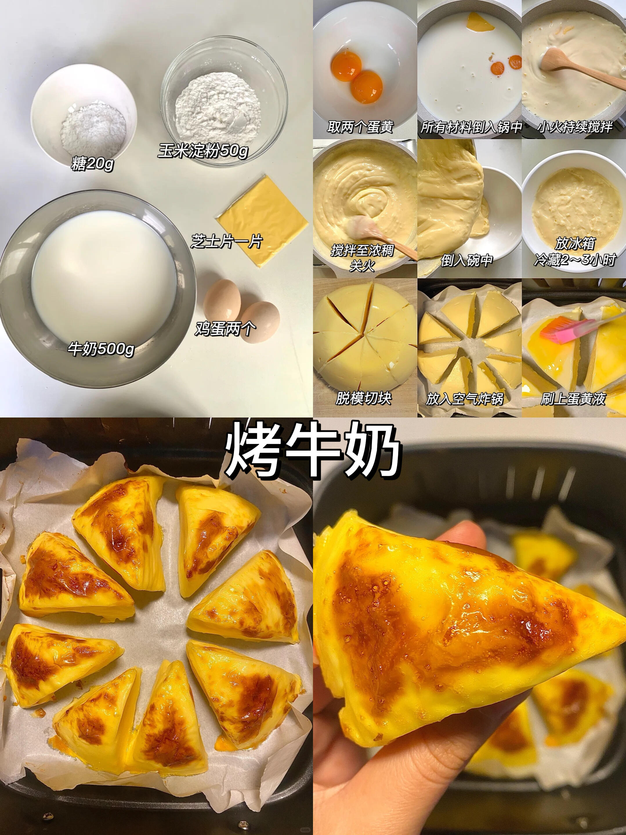 • 经典:牛奶+鸡蛋+玉米淀粉熬成糊,冷藏切块,刷蛋黄液烤到表面焦糖色,外脆里嫩!