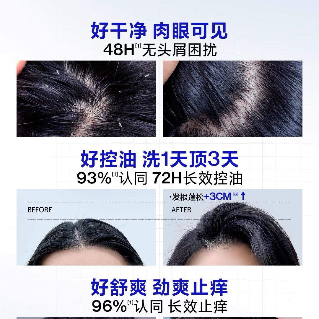 核心功效:实验室实测去屑率 93%,止痒时长 55 小时,连续 4 周头屑复发率降低 77%,头皮出油量减少 73%,洗后发丝不干涩。