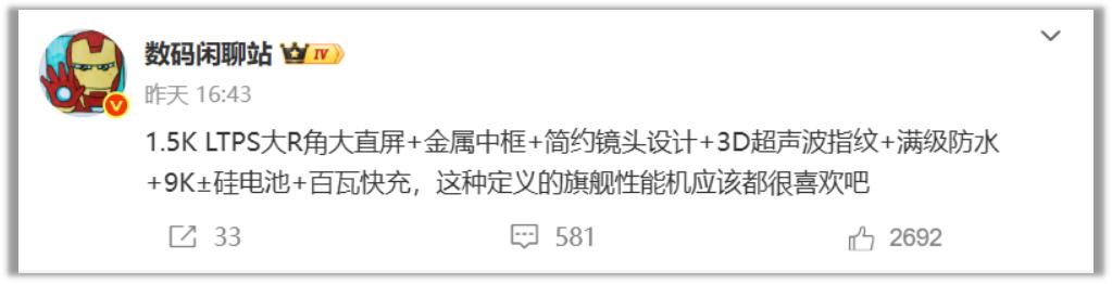博主数码闲聊站透露这款预计明年Q1发布的手机:1.5K LTPS大R角大直屏+金属中框+简约镜头设计+3D超声波指纹+满级防水+9K±硅电池+百瓦快充,这种定义的旗舰性能机应该都很喜欢吧