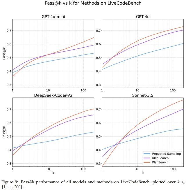 可以看到,在 Claude 3.5 Sonnet 上使用规划搜索方法时,在 LiveCodeBench 基准上得到了当前最佳的 pass@200 性能:77.0%。该表现优于不使用搜索时获得的最佳分数(pass@1 = 41.4%)以及标准的 best-of-n 采样方法的分数(pass@200 = 60.6%)。