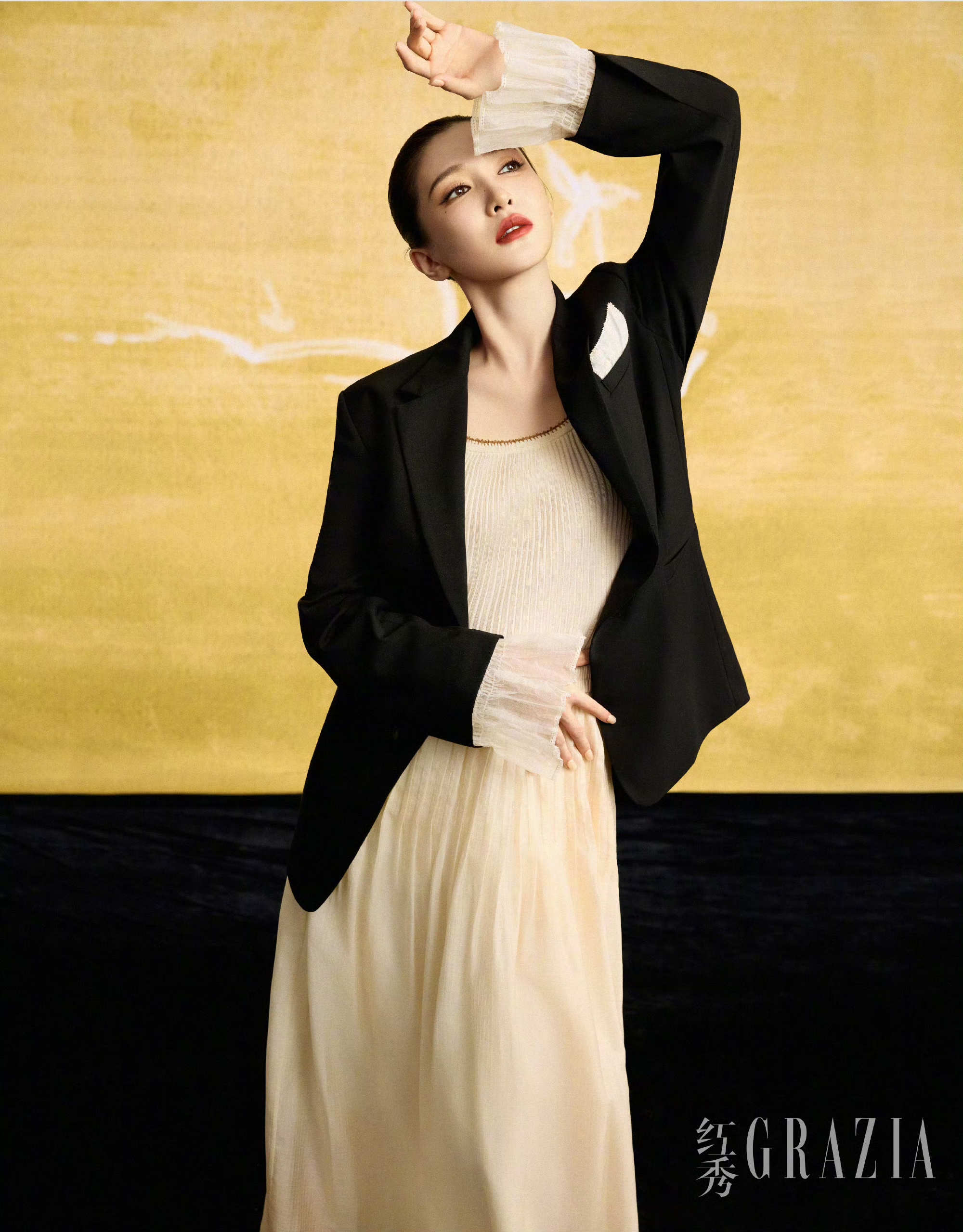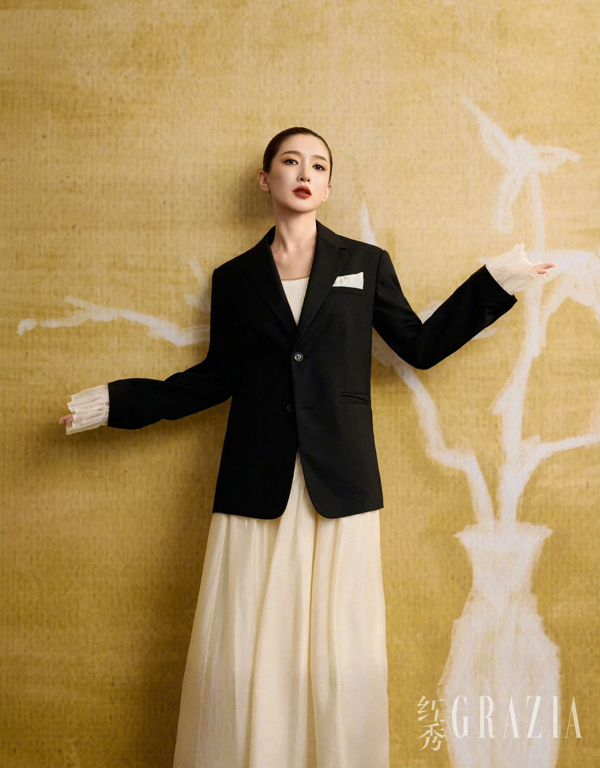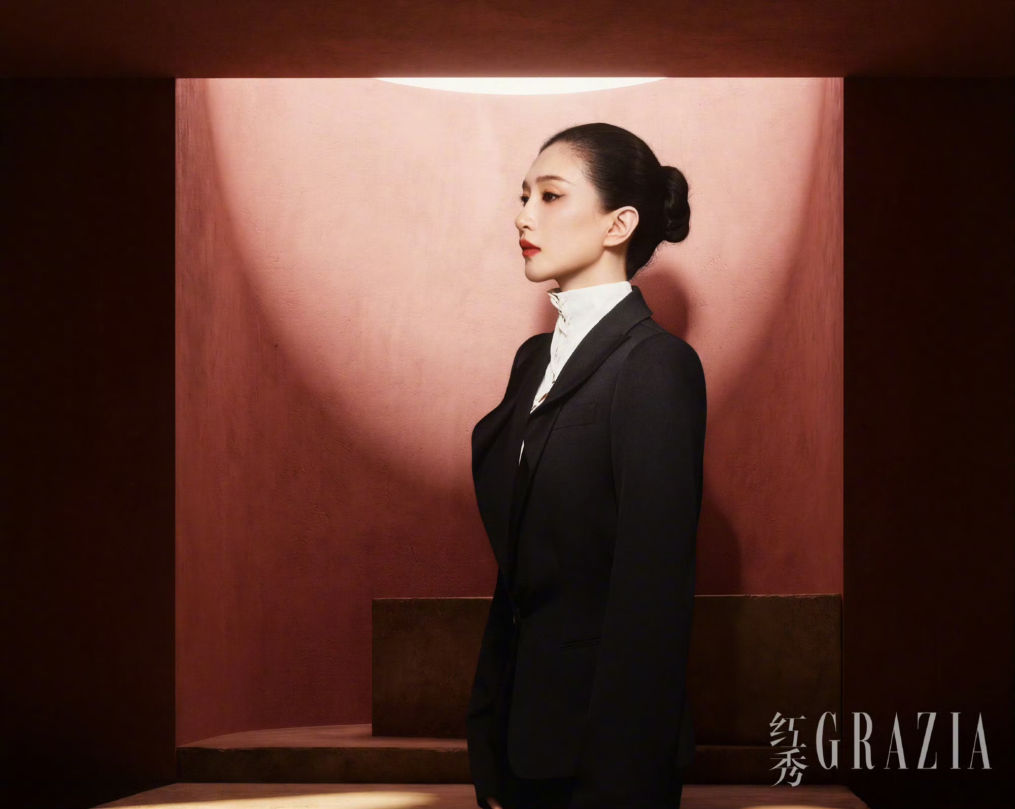 切换为干练西装造型,黑西装内搭白色立领衬衫,极简配色更显高级。侧身而立的她轮廓分明,清冷眼神望向远方,诠释着职场大女主的沉稳与飒爽。
