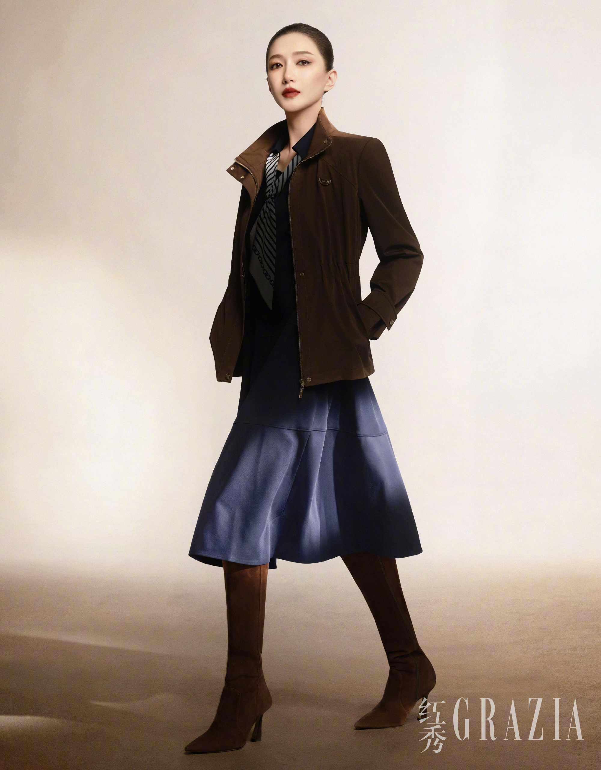 黑西装搭配米白纱裙,刚柔并济,将两种风格碰撞出极致美感;而棕咖色收腰夹克配蓝裙长靴,则是复古通勤风的最佳演绎,利落又大气。