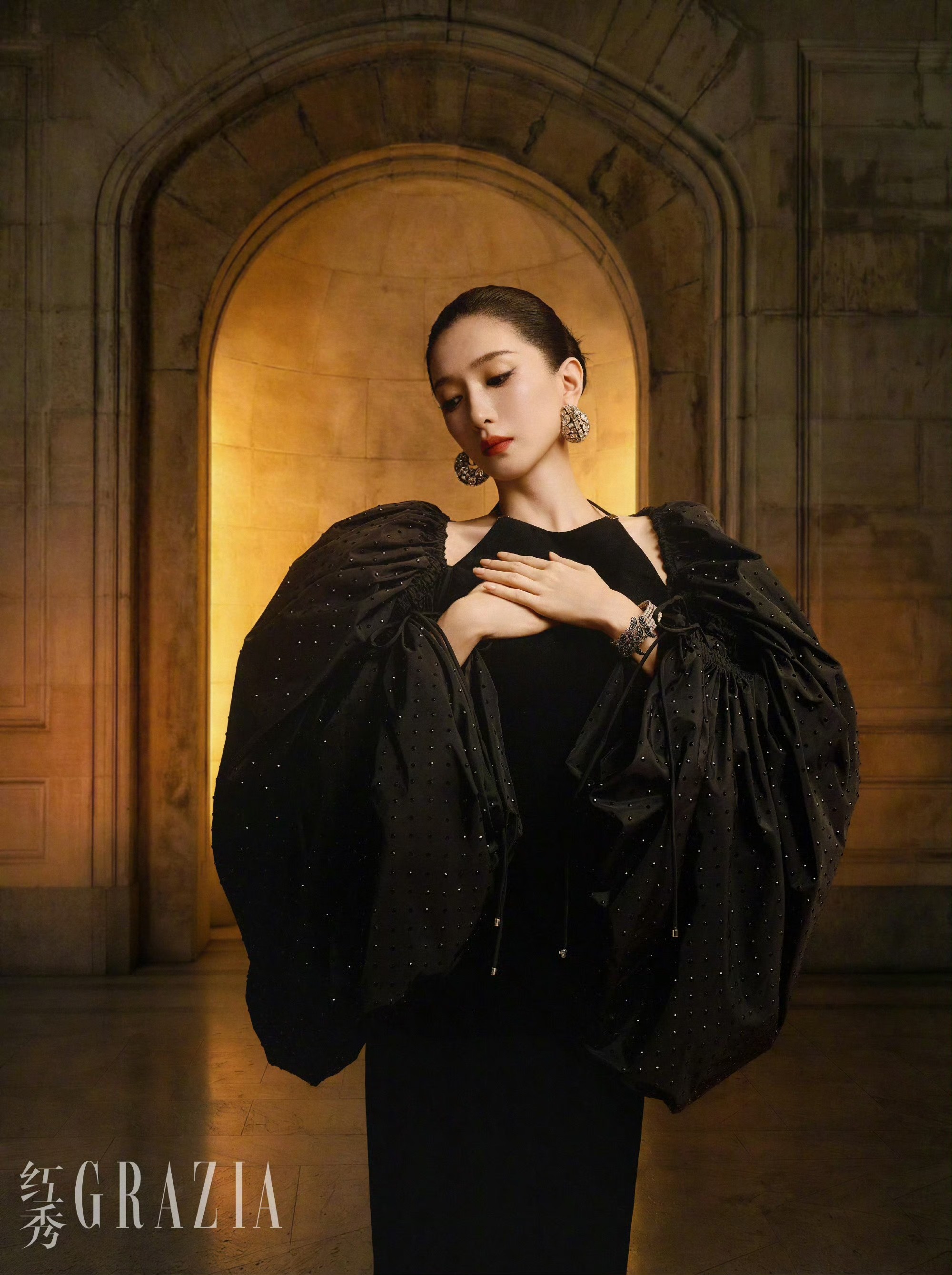 江疏影身着黑色挂脖丝绒长裙,搭配满是钻饰的泡泡袖,复古与华丽感拉满。盘发衬得肩颈线条愈发优越,双手轻放胸前的姿态自带故事感,仿佛从古堡中走出的优雅女王。